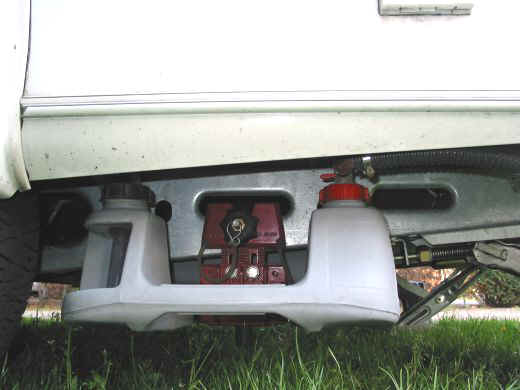 Le réservoir est posé sur le support d'origine Alko avec la roue de secours, derrière le timon.