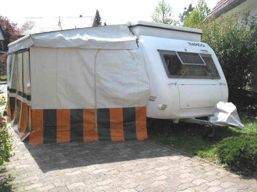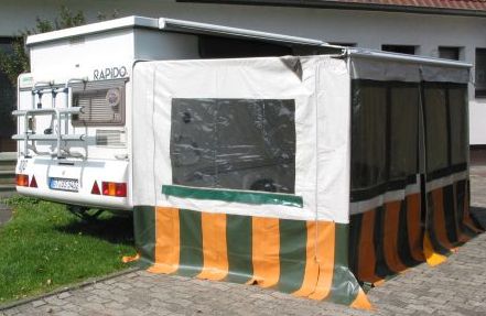 J'ai coupé les côté s et le devant du toit et j'ai cousu des poches pour tenir les côtés sur des barres Pour la partie front j'ai fabriqué un jonc pour le fixé dans le rail d'origine. Le rail est (exprès) trop petit pour les joncs normals. Les cotés sont fixé avec des boutons-pression autour des barres verticals d'Omnistore |