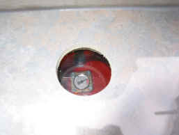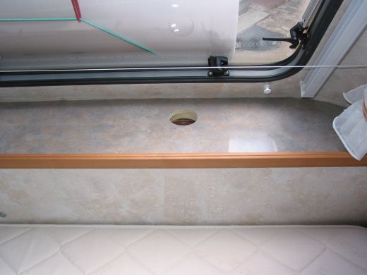 | Das ausgeschnittene Sichtfenster (mit Scheibe oben und unten abgedichtet) in der "Fensterbank" am Bett zur (morgendlichen) Kontrolle des Füllstandes | |