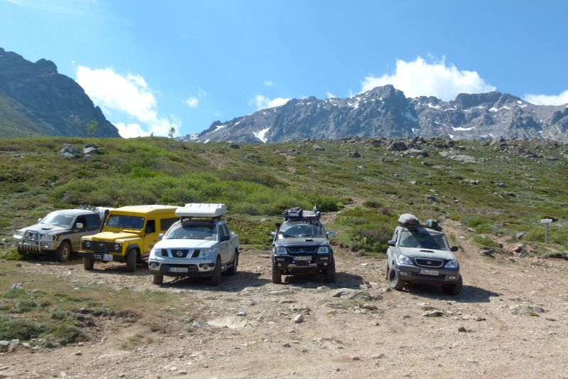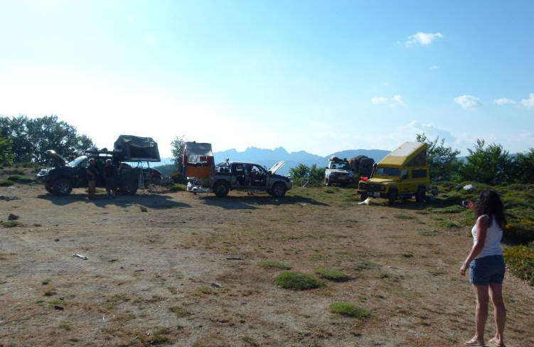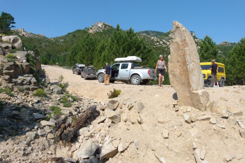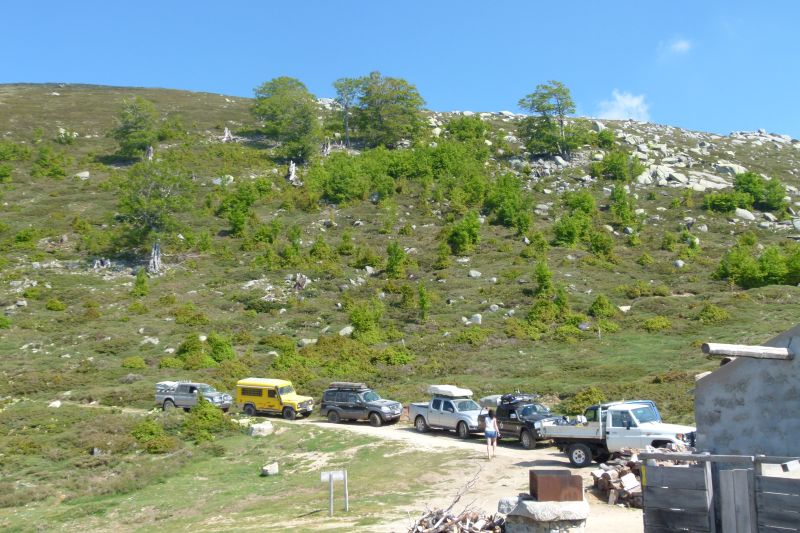 kämen. Nach dem Tanken und Einkaufen ging es über eine gut ausgebaute Straße und dann nach links entlang eines Flusses, wieder durch ein enges Flusstal zum Stausee Calacuccia, gelegen am gleichnamigen Ort. Dieser wurde auf der Suche nach einem geeigneten Picknickplatz umrundet und auf der anderen Seite in Sidossi fand sich endlich ein schattiger Platz. Es war schon halb drei und alle hatten mächtig Hunger. Einige hatten gegrillte Hähnchen gekauft und so wurde auf den Heckklappen unserer Autos ein Mittagsmahl mit Hähnchen gehalten. Nach einer nicht all zu langen Pause fuhren wir in Richtung Monte Cintu wo wir auf dem gleichnamigen Campingplatz übernachten wollten. Zunächst war aber noch eine Tour zum ehemaligen Refuge des Monte Cintu angesagt. Hélène und Cornelia wollten heute Keine Tour mehr fahren und blieben am Campingplatz, die anderen wagten den Aufstieg. Etwa eineinhalb Stunden Später trafen dann auch wir auf dem Campingplatz ein. Er war einfach aber wunderschön angelegt und sauber. Ein relativ schnelles Abendmal und dann senktesich auch schon die Dunkelheit über unsere Köpfe. Ich verlegt diesmal das Spülen auf den nächsten Morgen Da es mit der untergehenden Sonne auch schnell kalt wurde. Tagesetappe Plateau Coscione- Calacuccia = 167km |