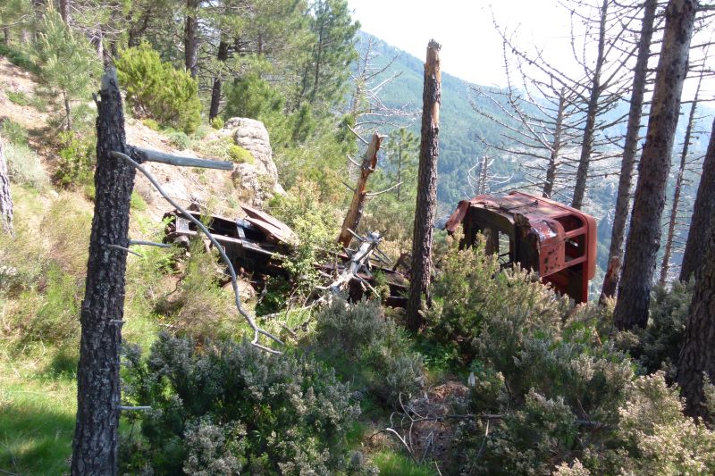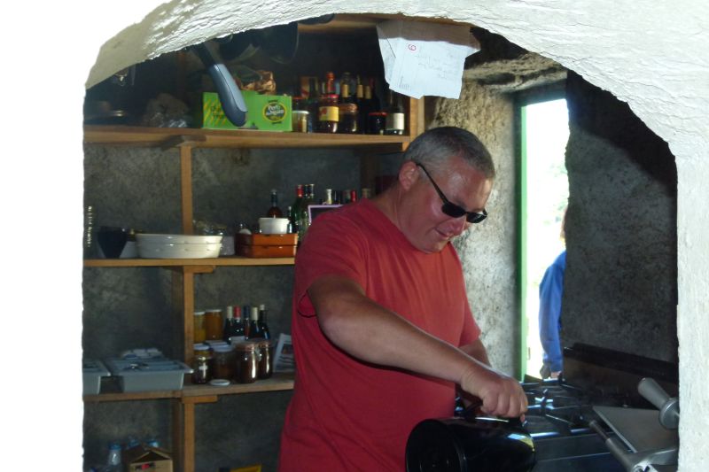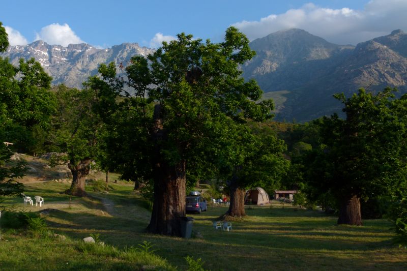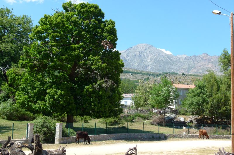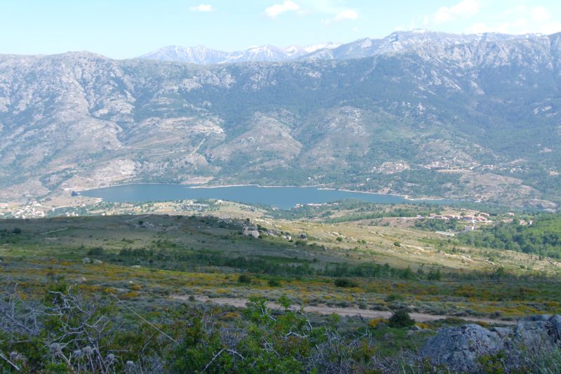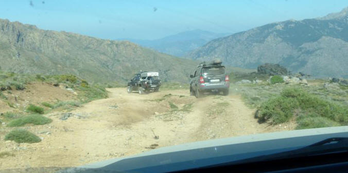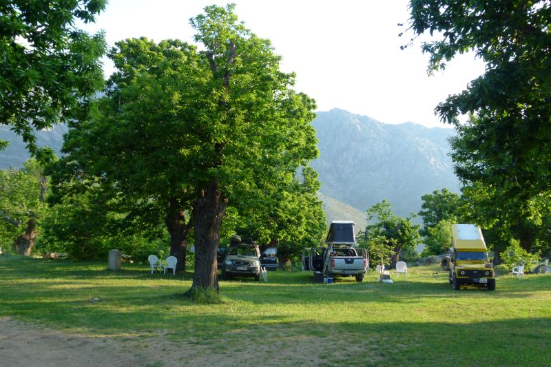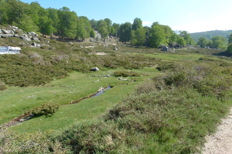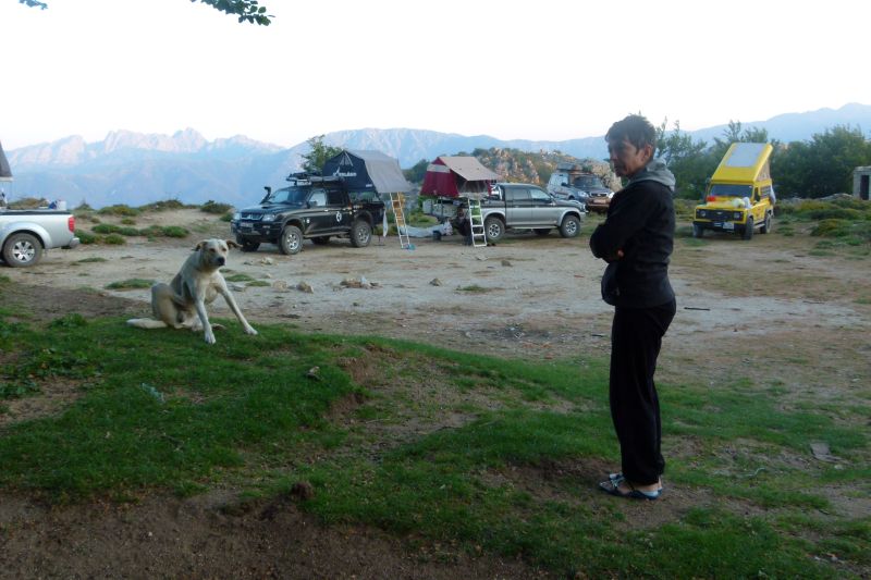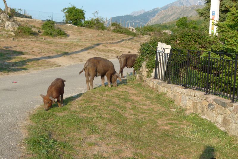 Mardi 24 mai, Le matin est frais et je me lève très tôt car j’entends les chèvres qui s’agitent à l’approche du berger qui vient pour la traite. Je lui demande si je peux regarder il est au milieu de ses bêtes dans l’étable et j’ai du mal à le voir, il en trait au moins 40 et ensuite il les lâche. Elles passent toutes devant moi, les plus espiègles font des cabrioles en me regardant. J’aimerais demander plus de détails au berger mais j’ai l’impression que je le dérange ou alors c’est un timide. Après le petit déjeuner, nous allons dire au revoir à nos hôtes et nous repartons. Cette fois-ci pas de piste mais une belle route qui suit des gorges magnifiques. Nous faisons halte à Corte pour les provisions mais pas de visite de la ville (dommage). Nous repartons et nous arrêtons plus loin au bord d’un lac de barrage où nous pique-niquons. Nous arrivons au camping Monte Cintu en début d’après-midi et je descends avec Cornelia pour visiter et retenir la place, pendant que les autres continuent sur la piste jusqu’au sommet. Le camping est calme et pratiquement vide. L’endroit est apaisant et nous en profitons pour boire un café à la buvette du camp. Les autres redescendent et nous installons le campement. Le soir je cuisine une omelette au brocciu (et elle est presque aussi bonne que celle que j’ai mangée la veille). Les autres grillent. Soirée calme… |