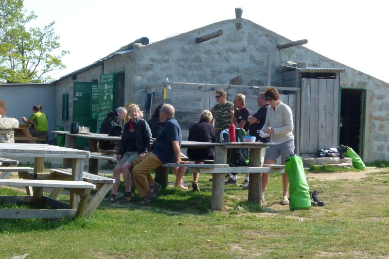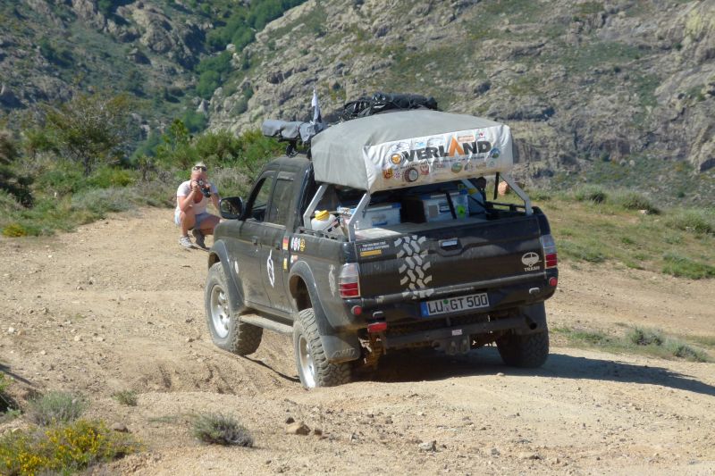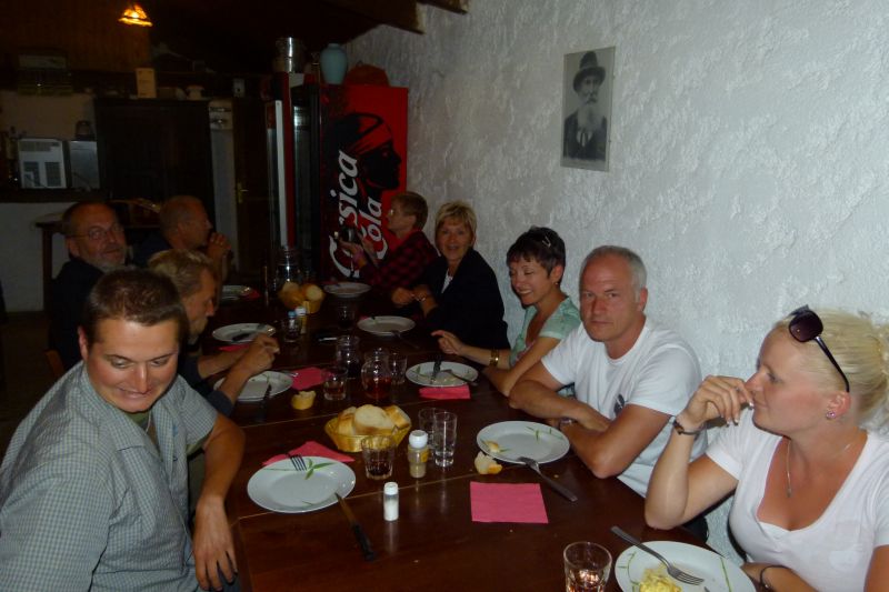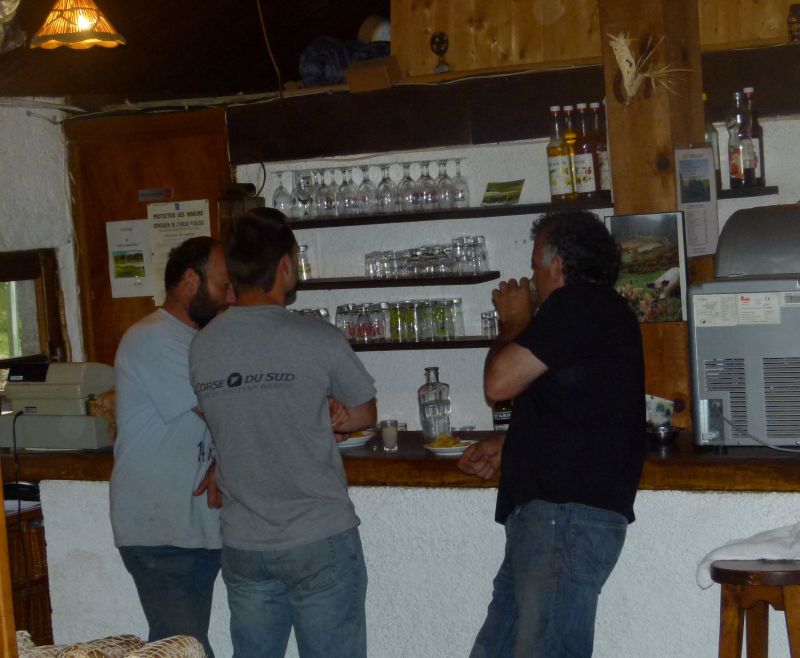 für uns suchen. Auf ausgesetzten Wegen, abwechselnd Pisten, Passstraßen, die Pisten glichen und Straßen wie Feldwege, vorbei an Zonza, schraubten wir uns von Meereshöhe bis zum refuge "I Crocci" auf das Plateau de Cuccione hinauf. Unterwegs wurden wir von einem Korsen angehalten, der eine Gruppe von Quads im Geländewagen anführte. Er meinte, uns den Weg verbieten zu müssen, da wir seiner Ansicht nach einen Führer nehmen müssten und nicht einfach mit Karte und GPS unseren Weg suchen dürften. Kurz zusammengefasst antwortete ich im, dass es ein öffentlicher Weg sei und er in Deutschland auch keinen Führer bezahlen müsste, wenn er dort nach Karte und Navi fahren würde. Wir ließen ihn stehen und fuhren weiter. An dem Refuge "I Crocchi" angekommen tranken wir einen Kaffee und unterhielten uns mit den Hüttenwirten. Super nette Leute!!!Gerade traf dort eine größere geführte Gruppe von Wenderern ein, diedort übernachteten. Wir fuhren dann zurück auf die auf 1100m gelegene Bergerie de Bassetta auf dem Plateau Coscione Plateau zu Füßen des Incudine. Von der Hüttenwirtin wurde ich gleich begrüßt mit :"Bonjour Bernard. Ich bin Sylvie, das ist Patrick und das ist der Chef" stellte sie sich und die anderen vor. Ich war total verdutzt und es dauerte eine Weile bis mir auffiel, dass ich ja das Gruppen-T-Shirt mit meinem Namen darauf anhatte. Auch hier tranken wir Kaffee und berieten dann das weitere Vorgehen. Wir kamen überein, das Menu für 20€/Person zu bestellen und zu fragen, ob wir dafür einen Schlafplatz bekommen könnten. Wir durften auf einer ebenen Fläche bei den Ziegenställen (130 Ziegen) parken und unser Lager aufschlagen. Den Abend verbrachten wir in der "bergerie" bei einem sehr guten Essen: Omlette de brocciu (Ziegenfrischkäse) mit Minzblättern als Vorspeise, Wildschweinragout auf Reis als Hauptgericht, auf der Hütte hergestellter „Ziegen“-Käse und von Sylvie selbstgebackene "tarte" (Obstkuchen) Vor dem Essen hatte ich, während die anderen draußen ihren Aperitif (Cap Corse) zu sich nahmen, mit Einheimischen an der Theke einige Pastis getrunken und mich sehr gut unterhalten. Nach dem Essen gab es noch einige "dégestifs" und als wir die gastliche Stätte verließen (mit einer kleinen Dankeskarte für Sylvie) waren alle zufrieden und, zumindest ich, gut abgefüllt. Tagesetappe Pinarellu - Bassetta = 102km |