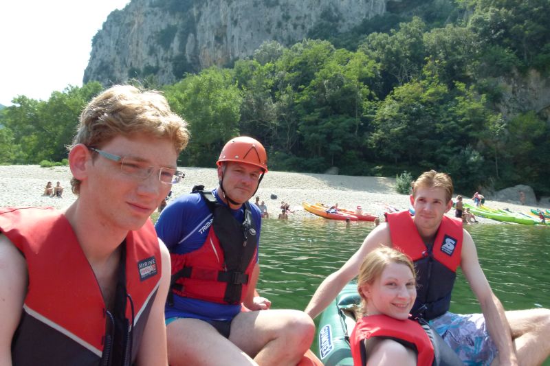 Wir fuhren mit zwei Wagen. Aiguèze ist eine wunderschöne kleine Festung. Allen hat die Stadt und die Aussicht über einen Teil des Ardèche- und Rhonetales gefallen. Auch der Mont Ventou war von dort aus klar zu sehen. Auf dem Friedhof gab es sogar frische blaue Feigen direkt vom Baum. Leider blieb uns nur eine Stunde, dann mussten wir weiter zur Grotte. Hélène wollte lieber in der Sonne bleiben und so ging ich mit den "Kindern". Der Wunsch, die Grotte zu besichtigen, war von Raphael gekommen und er hatte damit Recht. Auch diese Grotte hatte wieder ihre Einmaligkeit, die es sonst nirgendwo anders in Europa zu sehen gibt: Sinterbecken in Form von Kaskaden, wunderbar beleuchtet, und eine "Kathedrale", animiert mit Ton und Licht. Rechtzeitig vor dem Reittermin war die Führung zu Ende und die "Madels" fuhren mit dem Passat dorthin während wir Jungs mit dem Navara zum Campingplatz zurückfuhren. Als sie nach gut 2 Stunden zurückkamen strahlten ihre Augen und sie waren begeistert von dem Ausritt auf Westernpferden durch die "Garigue" (mannshoher Wald) mit wunderschönen Aussichten über das Tal. Aber keiner hatte an einen Fotoapparat gedacht. Zum Abend aßen wir Spaghetti Carbonara und gingen dann schlafen, da wir am nächsten Tag die Große Tour (22km) mit dem Kanu machen wollten. Wir alle hatten wegen der Länge reichlich Respekt vor dieser Tour. |