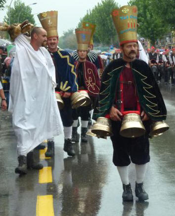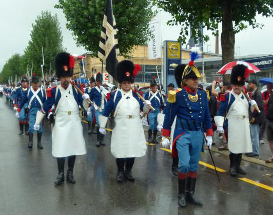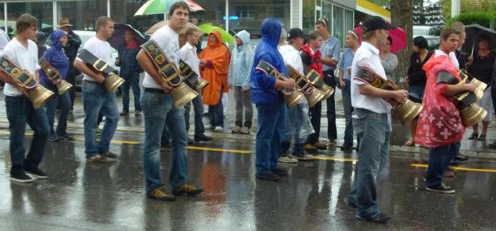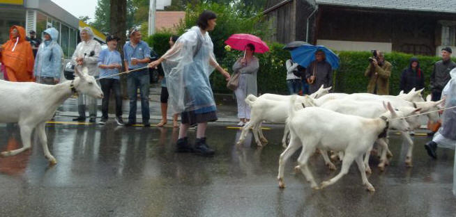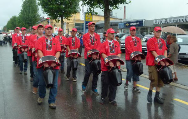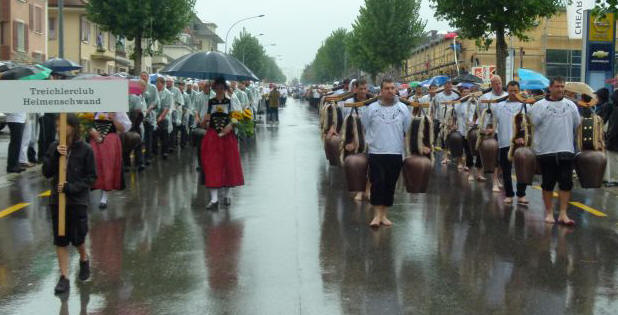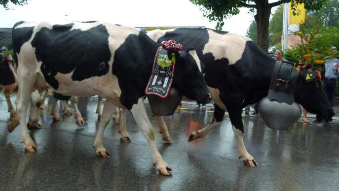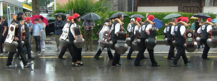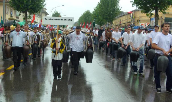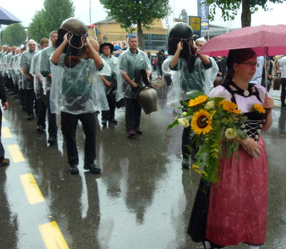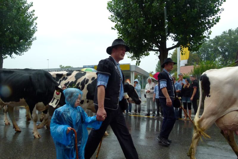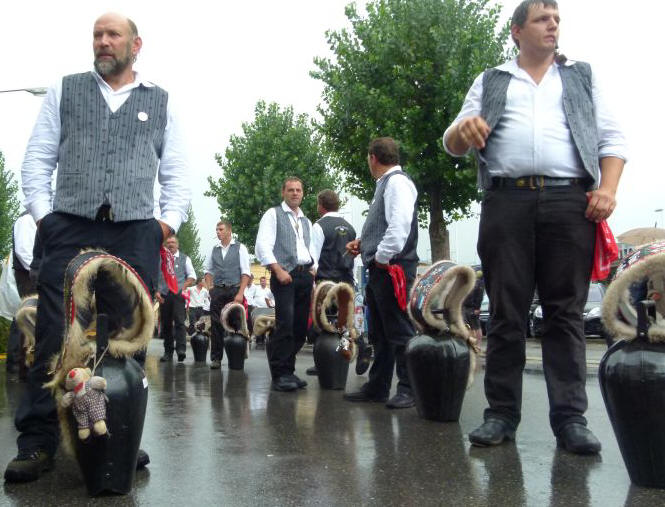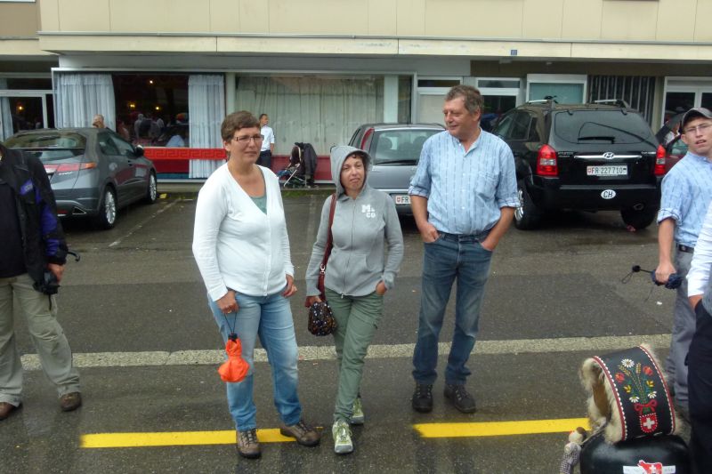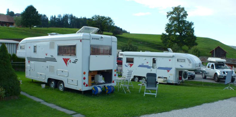 Außerdem wollten sie 7 Franken/Person. Wir fuhren also weiter nach Bulle (gesprochen: Büll). Dort war das jährliche Treffen der Trychler (aus dem Schweizerdeutsch für Kuhglocken-Schellen. Wir haben uns das nicht vorstellen können als Monique uns sagte, dass ungefähr 30.000 Zuschauer erwartet würden. Aber als dann Hunderte von Gruppen mit Tausenden von Kuhglocken trychelnd in einem nicht endenden Zug an uns vorbeizogen war das schon imposant. Die Phonzahl war bestimmt vergleichbar mit einem Düsenflugzeug und ich war zufrieden, mich bei den vorher verteilten Ohrstöpsel bedient zu haben. Zirka 2 Stunden sahen/hörten wir dem Treiben zu. Es regnete immer wieder aber die Trychler wurden nicht müde, ihre Trychlen aus gehämmerten Metall im Rhytmus ihrer Schritte klingen zu lassen. Gegen 17Uhr fuhren wir zum Campingplatz zurück. Es regnete nun Bindfäden und während unsere Freunde das Essen vorbereiteten, räumten wir zusammen uns spannten an. Nach dem Essen (Roland hatte Schweinenacken auf dem Grill und dazu Reis und Grilltomaten gemacht) verabschiedeten wir uns kurz aber herzlich und dankten den beiden für ein tolles gemeinsames Wochenende. Hoffentlich halten sie Wort und kommen nächstes Jahr zu uns .... Gegen 20Uhr fuhren wir los und blieben wegen eines Staus Richtung Bern zunächst noch auf der Landstraße. Als es Dunkel wurde, waren wir auf der Autobahn. Wir fuhren noch über Zürich und Schaffhausen über die Deutsche Grenze und legten uns auf einem Rastplatz gegen 23 Uhr Schlafen. Früh am Morgen wurden wir vom Lärm der Autos geweckt aber wir wollten sowieso um 8 Uhr weiter. Ich rief bei Tischer an und kündigte mich zur Abdichtung der Dachhaube an. Obwohl fast alle Mitarbeiter zur Messe in Düsseldorf waren, kümmerte man sich trotz Mittagszeit sofort um mich und eine Stunde später war die Dachhaube neu eingesetzt und abgedichtet. Toller Service. Wir aßen noch in Marktheidenfeld zu Mittag und um 19Uhr kamen wir zu Hause an. Die Kinder empfingen uns erfreut. Auspacken war für den nächsten Tag angesagt. |