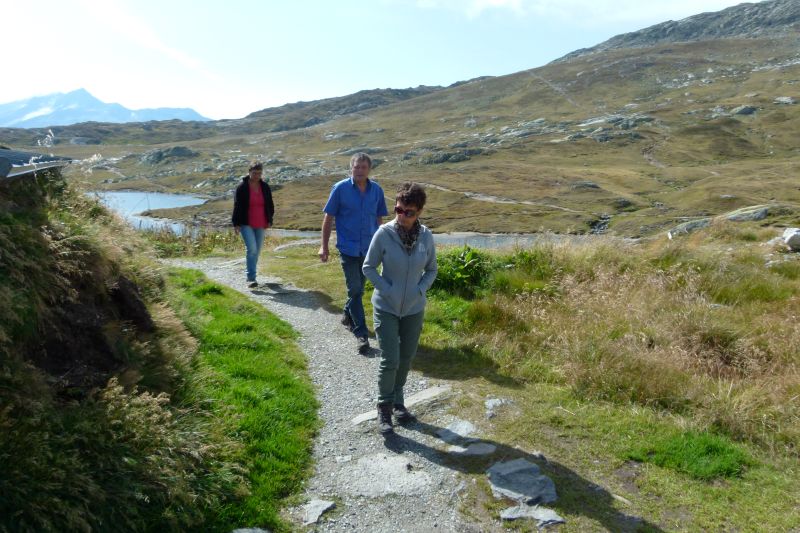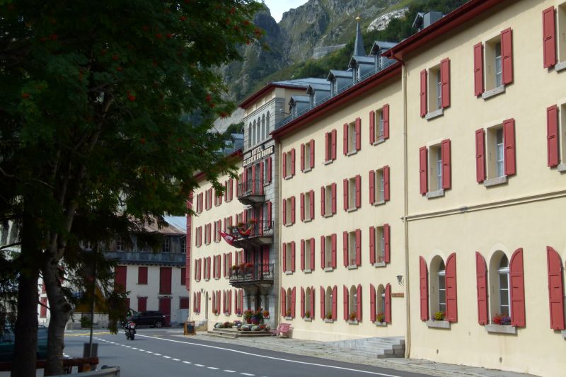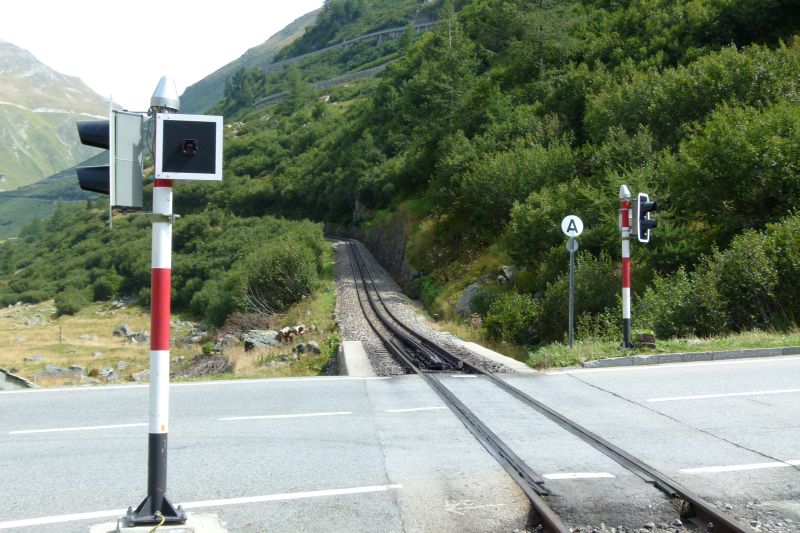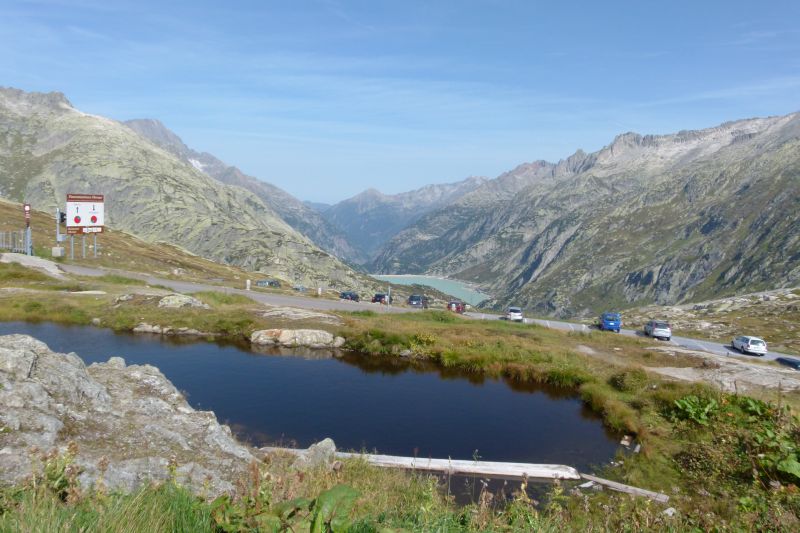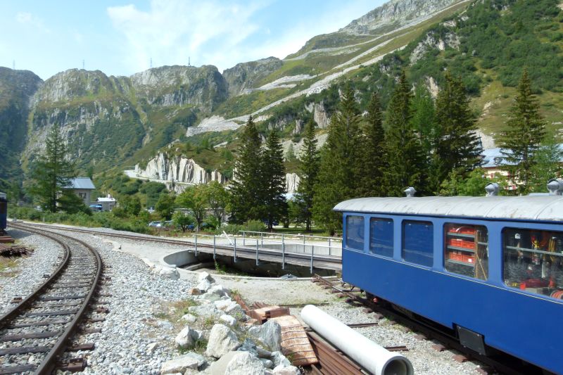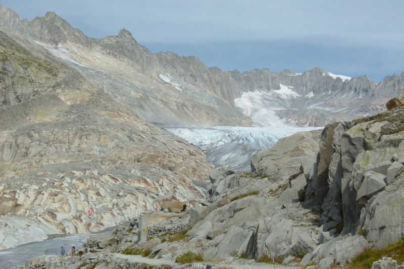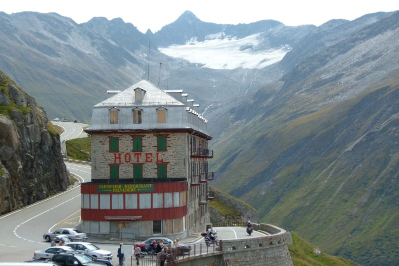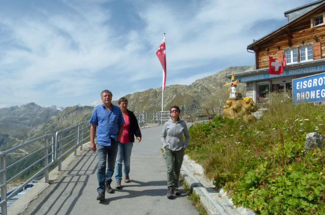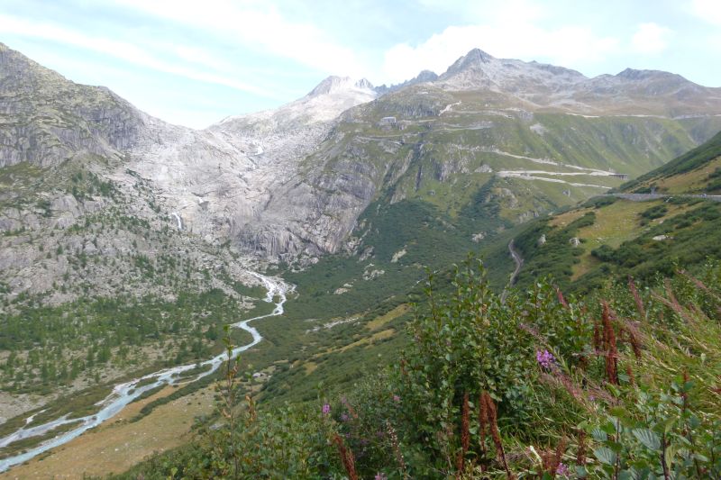 im Vordergrund und links der Furka-Pass, in der Mitte die Rhone,