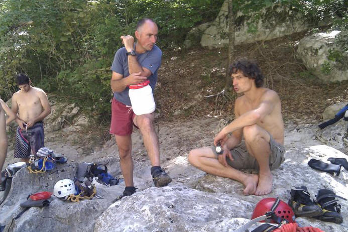 Canyoning an der unterhalb der Einfahrt aufgestellten