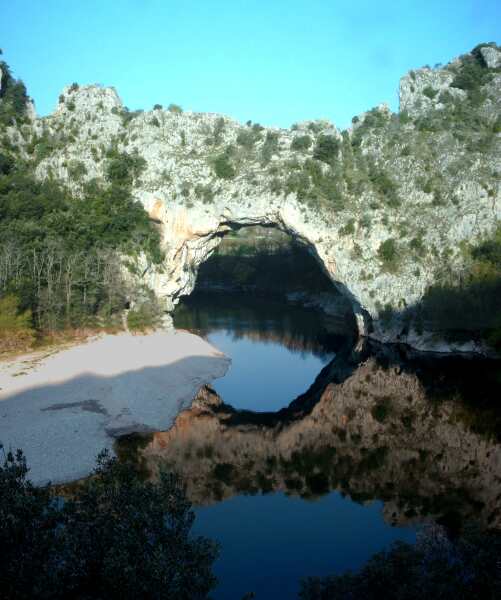 Hochebene entlang der Schlucht des Ardeche führt. Bis hier reiht sich ein Campingplatz an den anderen (Vorsaisonpreis ab 12 €). Diese waren schon vor (!!) Ostern offen und teils sehr gut von Deutschen besucht. Man erzählte uns, dass gerade in den Osterferien die Deutschen dort zum Kanufahren kommen, weil die Wasserstände noch genügend hoch sind. Natürlich haben wir uns hier die Pont d'Arc von allen Seiten genau