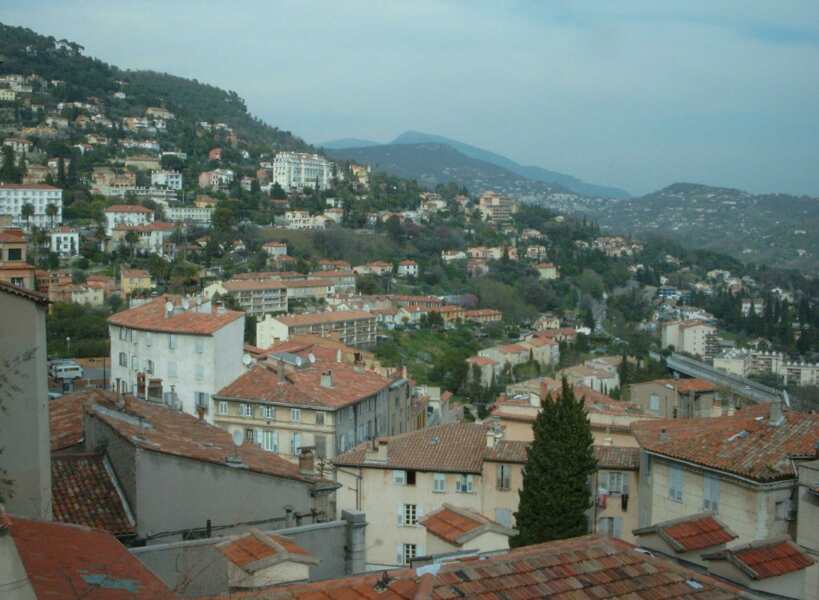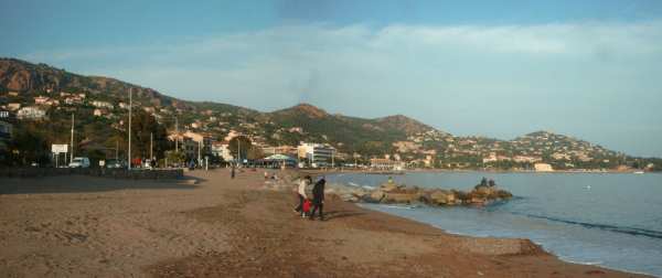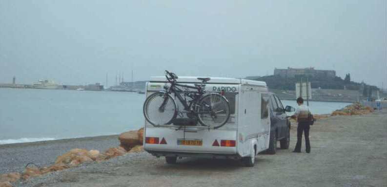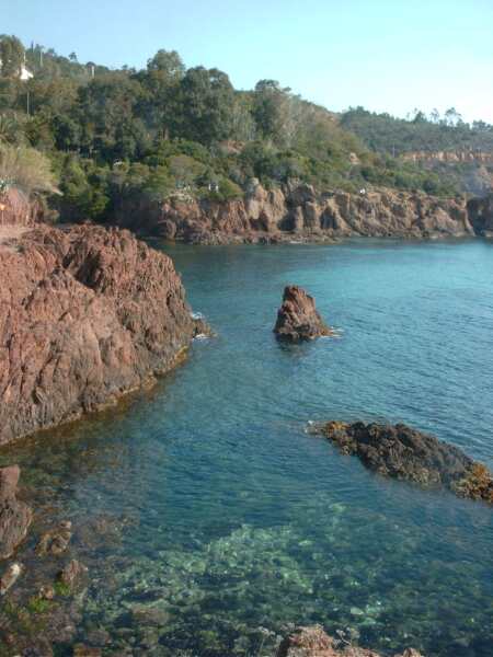 Mittags hängten wir unseren Wohnwagen wieder an und fuhren Richtung Nizza bis ans Meer und dann die Küstenstraße entlangt bis kurz vor Antibes. 15 Jahre zuvor gab es hier einmal einen Strandabschnitt, auf dem man mit Wohnwagen und Wohnmobil parken konnte und ... kaum zu glauben.... es gab ihn immer noch. Leider war der Himmel an diesem Morgen stark dunstig und die Sonne machte sich rar. Trotzdem ließen wir es uns nicht nehmen, im "Zimmer mit Meerblick" zu Mittag zu essen. Weiter ging's anschließend durch Antibes, vorbei am Antiquitätenmarkt vor den Stadtmauern, durch das Stadttor und links hinauf auf die Stadtmauer zum Meer. Hier kam ich doch ins Schwitzen, da mit dem 10 m langen Gespann rechtwinklig verlaufende Straßen zu bewältigen waren und Scharen von Fußgängern sich zwischen Gespann und Wehrmauer durchquetschten. Glücklicherweise wurde es dann doch nicht mehr enger und wir kamen heil hier raus. Weiter, immer der Küste folgend, durch Cannes, vorbei an "La Croisette" und dem Hafen mit den schmucken Jachten kamen wir zum für mich schönsten Abschnitt der Côte d'Azur, der "Cornische de L'Estérel". Immer wieder, wo es möglich war, hielten wir an, um die roten Felsen zu betrachten, die ins azurblau Meer stoßen. Inzwischen kam die Sonne hervor und zeigte uns die Farben der Küste.