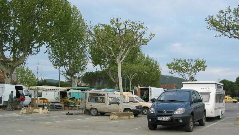 Übernachtung auf dem Parkplatz, morgens eingerahmt von Marktständen